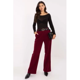 Sametové dámské kalhoty s širokými nohavicemi jsou kombinací elegance a pohodlí v moderním provedení. Vyrobené z měkkého materiálu s různorodou strukturou sametu, s příměsí polyesteru a elastanu, zajišťují pohodlí nošení a skvělé přizpůsobení postavě. Vysoký pas krásně zdůrazňuje pas, zatímco široké nohavice dodávají kalhotám moderní, volný charakter. V zadní části je vsazena elastická guma pro ideální přizpůsobení, zatímco vložené boční kapsy zvyšují funkčnost modelu. Další výhodou je zapínací pásek, který celkově doplňuje a umožňuje stylové dokončení outfitu. Ideální na každý den a do práce, skvěle ladí jak s elegantní košilí, tak s volným svetrem.