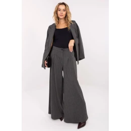 Elegantní dámské látkové kalhoty typu palazzo jsou skvělou volbou na každý den, do práce a na společenské události, kdy je důležitý šarm a moderní forma. Jejich decentní pruhovaný vzor opticky zúží postavu a zároveň dodává kalhotám elegantní, klasický charakter. Model je vyroben z vysoce kvalitní směsi nylonu, viskózy, elastanu a polyesteru, díky čemuž jsou kalhoty lehké, prodyšné, elastické a pohodlné na nošení. Vysoký pas krásně zdůrazňuje pas, zatímco široké nohavice typu palazzo dodávají celku volný a zároveň velmi elegantní střih. V horní části přední strany jsou ozdobné záložky, které kalhotám dodávají výjimečný charakter a decentně zdůrazňují elegantní styl. Praktické zapínání na zip a knoflík zajišťuje pohodlí a stabilní přizpůsobení. Jsou to kalhoty, které spojují nadčasový styl s moderním střihem, ideální pro ženy, které oceňují eleganci, pohodlí a rafinované detaily.