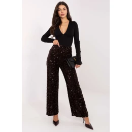 Elegantní látkové kalhoty s flitry, navržené na výjimečné příležitosti, jako jsou společenské události a večírky. Vyrobené z kombinace polyesteru a elastanu, kalhoty zajistí pohodlné padnutí a jemný lesk díky aplikaci flitrů, která jim dodává výraznosti. Model s rovnými nohavicemi a vysokým pasem jemně prodlužuje postavu. Bez zapínání a kapes dodává celkovému vzhledu hladký, minimalistický vzhled, a jemná podšívka zajišťuje pohodlí nošení. Tyto kalhoty jsou ideální volbou, pokud chcete outfitu přidat elegantní, efektní akcent.
