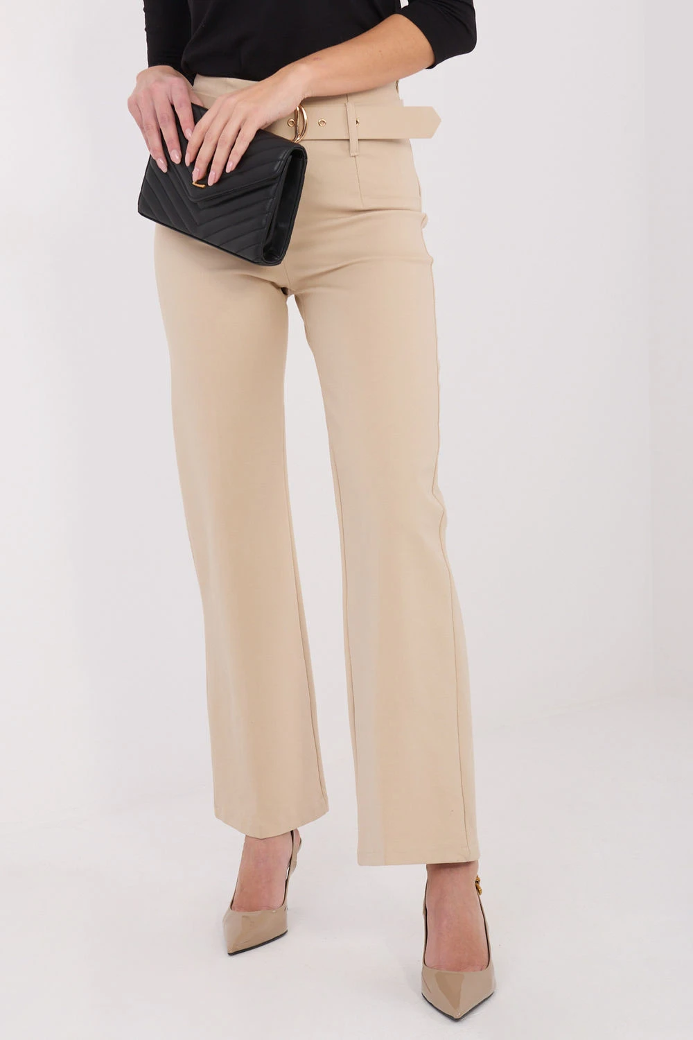 Tyto stylové kalhoty byly navrženy s ohledem na ženy, které si cení elegance spojené s pohodlím. Vyrobené z vysoce kvalitní směsi viskózy, nylonu a elastanu, zaručují perfektní přizpůsobení a pohodlí při nošení po celý den, bez ohledu na příležitost. Hladký, klasický materiál jim dodává nadčasový vzhled, a vysoký pas krásně zdůrazňuje pas a prodlužuje siluetu. Přímé nohavice typu straight leg jim dodávají elegantní a stylový vzhled, skvěle se hodí jak do práce, každodenních outfitů, tak i k výstavním stylizacím. Model se zapíná na skrytý zip, co zdůrazňuje pečlivé provedení. Další výhodou je pásek s přezkou v pasu, který umožňuje perfektní přizpůsobení a slouží jako decentní dekorativní prvek. Charakteristický záhyb na zadní straně nohavice dodává kalhotám eleganci a zdůrazňuje jejich elegantní charakter. Univerzální, pohodlné a nadčasové, ideální k jakémukoli outfitu, ve kterém se počítá se stylem a pohodlím.