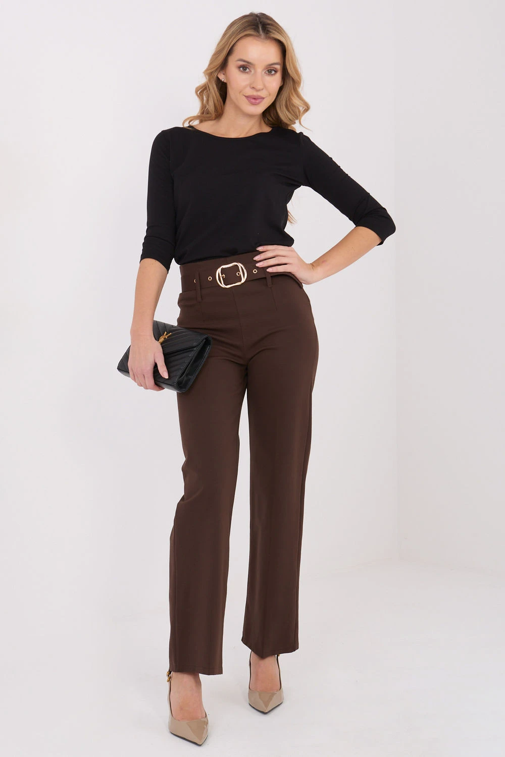 Tyto stylové kalhoty byly vytvořeny s ohledem na ženy, které si cení eleganci spojenou s pohodlím. Vyrobené z vysoce kvalitní směsi viskózy, nylonu a elastanu, zajistí ideální přizpůsobení a pohodlí při nošení po celý den, bez ohledu na příležitost. Hladký, klasický materiál jim dodává nadčasový vzhled, a vysoký pas krásně zdůrazňuje pas a prodlužuje siluetu. Přímé nohavice typu straight leg jim dodávají elegantní a stylový vzhled, skvěle se hodí jak do práce, tak do každodenních outfitů, stejně jako do společenských stylizací. Model se zapíná na skrytý zip, co zdůrazňuje pečlivé dokončení. Další výhodou je opasek se zapínáním v pase, který umožňuje ideální přizpůsobení a zároveň slouží jako decentní dekorační prvek. Charakteristický ohyb na zadní straně nohy dodává kalhotám eleganci a zdůrazňuje jejich elegantní charakter. Univerzální, pohodlné a nadčasové, ideální pro každý outfit, ve kterém záleží na stylu a pohodlí.