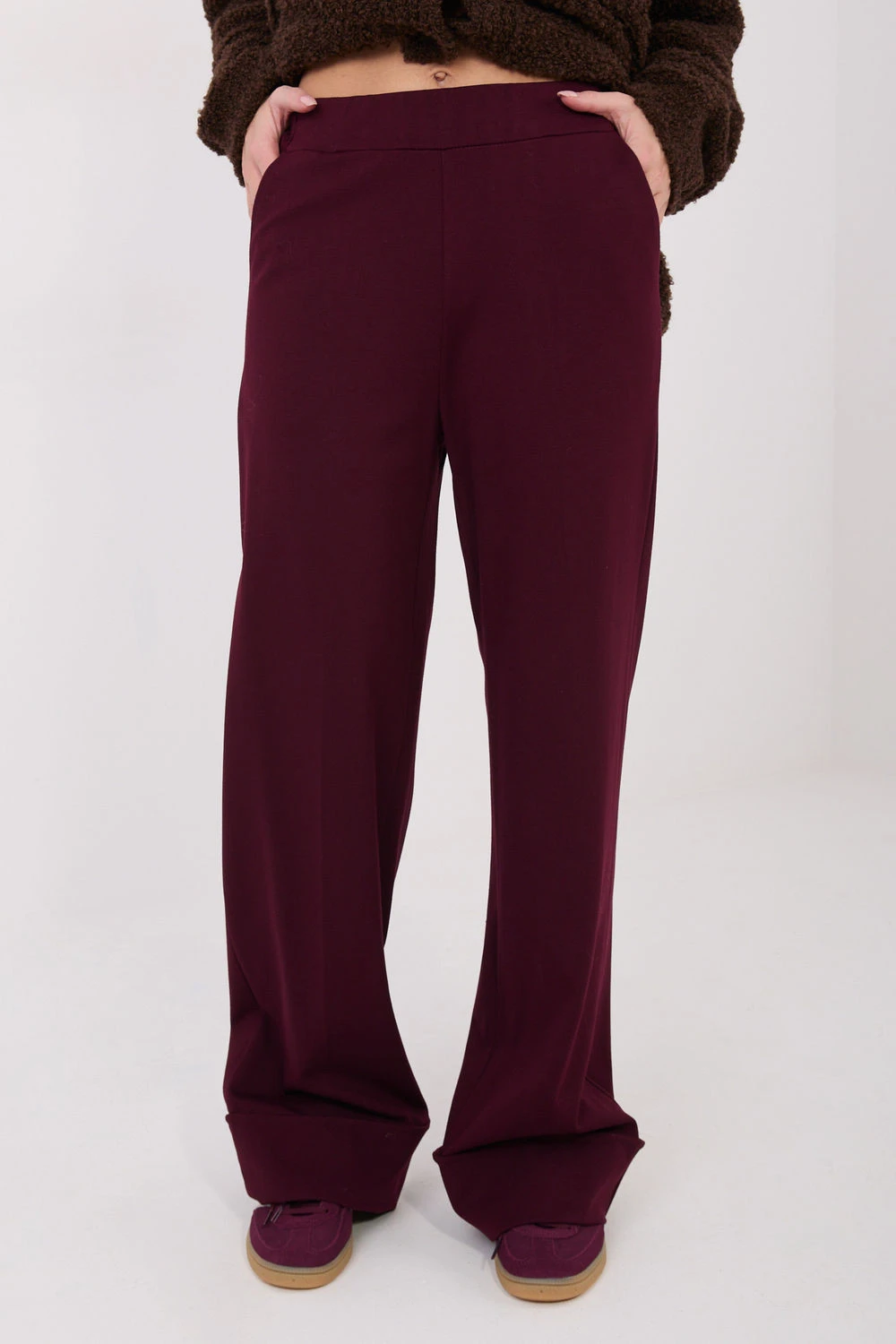 Elegantní a pohodlné dámské kalhoty s širokými nohavicemi, ideální na každý den i do práce. Vyrobené z směsi viskózy, nylonu a elastanu, jsou měkké, prodyšné a elastické, což zajišťuje pohodlí po celý den. Dominantní hladký vzor jim dodává univerzální a nadčasový charakter. Kalhoty mají vysoký pas, který krásně zdůrazňuje pas. Na zadní straně pasu je vsazena elastická guma, která zajistí ideální přizpůsobení a pohodlí nošení bez nutnosti použití zapínání, model je úplně bez zapínání. Na spodní části nohavic je široký obrub, který přidává módní a uvolněný akcent. Široké nohavice a lem dodávají kalhotám elegantní dokončení, zachovávajíce zároveň neformální charakter. Funkční boční, vsazené kapsy zvyšují praktičnost modelu.