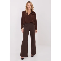 Moderní a pohodlné dámské kalhoty s širokými nohavicemi, skvělé pro každodenní i kancelářský styl. Vyrobené z směsi viskózy, elastanu a nylonu jsou měkké, pružné a skvěle padnou na postavu, zajistí pohodlí po celý den. Hladký vzor dominuje, což činí kalhoty univerzálními a snadno kombinovatelnými s různými kousky šatníku. Model má vysoký pas, který zdůrazňuje pas a zjemňuje postavu. Kalhoty nemají žádné zapínání, co zvyšuje pohodlí nošení, rychle a pohodlně se oblékají. Široké nohavice dodávají celku lehkost a moderní charakter, a absence kapes zajišťuje hladkou, minimalistickou linii. Ideální pro ženy, které oceňují pohodlí, jednoduchost a moderní styl.