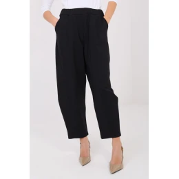 Pohodlné a stylové látkové kalhoty s ležérním charakterem, ideální na každý den a do práce. Vyrobené z směsi viskózy, nylonu a elastanu, poskytují pohodlí, pružnost a elegantní uspořádání materiálu. Hladký, jednotný vzor z nich dělá univerzální a snadno kombinovatelné s mnoha styly. Model má vysoký pas, který krásně zdůrazňuje pas, a gumový pásek zajišťuje ideální přizpůsobení a pohodlí nošení bez nutnosti zapínání, kalhoty nemají zapínání. Zúžené nohavice dodávají siluetě lehkost a opticky ji prodlužují. Pro větší funkčnost jsou kalhoty vybaveny bočními kapsami, které zůstávají praktické a zároveň neporušují minimalistickou linii celého modelu. Pohodlné, praktické a stylové, ideální pro každodenní, moderní stylizace.