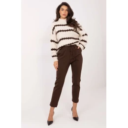 Dámské látkové kalhoty ve stylu casual jsou pohodlným a univerzálním návrhem na každý den. Vyrobené z vysoce kvalitní směsi bavlny, elastanu a nylonu poskytují pohodlí nošení, pružnost a odolnost. Hladký materiál jim dodává nadčasový charakter, který lze snadno sladit s různými styly. Model s vysokým pasem krásně zdůrazňuje pas a zajišťuje pohodlné padnutí. Zúžené nohavice s délkou 7/8 dávají kalhotám moderní vzhled a opticky prodlužují postavu. Šňůrka na pasu umožňuje individuální přizpůsobení a praktické boční kapsy zvyšují funkčnost. Kalhoty se skvěle hodí do každodenních outfitů, ať už s košilí, svetrem nebo sportovním mikinou.
