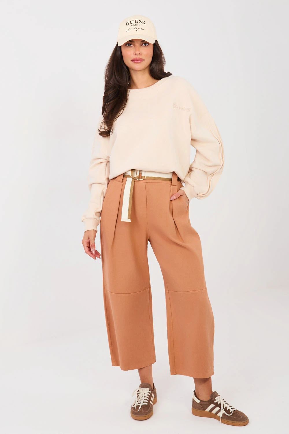Moderní dámské džínové kalhoty typu wide leg, které spojují pohodlí s moderním stylem. Vyrobené z vysoce kvalitní bavlny s přídavkem elastanu, zaručují pohodlí při nošení a volnost pohybů po celý den. Model má vysoký pas a vsazenou gumu v pase, díky čemuž se dokonale přizpůsobuje postavě bez nutnosti zapínání. Záložky vpředu přidávají eleganci a opticky zúžují nohy. Široké nohavice zdůrazňují módní charakter kalhot a zajišťují lehkost stylizace. Kalhoty jsou vybaveny bočními kapsami a zapínacím páskem, který je praktickým a stylovým doplňkem. Hladký vzor zaručuje, že se tento model skvěle hodí jak do každodenních stylizací, tak i do práce v casualovém provedení. Univerzální, pohodlné a stylové ideální základ pro mnoho outfitů.