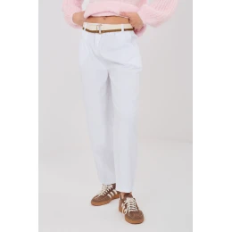 Pohodlné a stylové kalhoty ve střihu mrkve, ideální pro každodenní, neformální stylizace. Vyrobené z vysoce kvalitní bavlny s přídavkem elastanu, co zajišťuje pohodlí a lehkost nošení a jemnou pružnost. Kalhoty mají vysoký pas a nohavice jsou zúžené a sahají do délky 7/8, co dodává moderní charakter. V pasu je vsazena guma a navíc jsou kalhoty vybaveny páskem s možností zapínání, co umožňuje ideální přizpůsobení. Praktické boční kapsy zvyšují funkčnost a hladký vzor umožňuje snadné kombinování s různými kousky šatníku. Tyto kalhoty jsou skvělou volbou pro ty, kteří ocení pohodlí, volnost pohybu a moderní neformální vzhled.