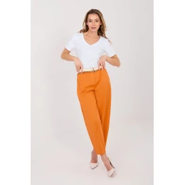 Pohodlné a stylové kalhoty v kroji mrkve, ideální pro každodenní, neformální stylizace. Vyrobené z vysoce kvalitní bavlny s přídavkem elastanu, co zaručuje pohodlí a lehkost nošení a jemnou pružnost. Kalhoty mají vysoký pas, nohavice jsou sešity a sahají po délce 7/8, co dodává moderní charakter. V pase je vsazena guma a navíc mají kalhoty pásek s možností zapínání, co umožňuje ideální přizpůsobení. Praktické boční kapsy zvyšují funkčnost a hladký vzor umožňuje snadno je kombinovat s různými kousky garderoby. Tyto kalhoty jsou skvělou volbou pro ty, kdo ocení pohodlí, volnost pohybu a moderní neformální vzhled.