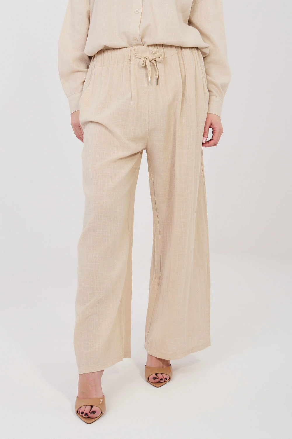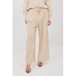 Elegantní dámské kalhoty s širokými nohavicemi, které spojují pohodlí s moderním a volným stylem. Model má široké nohavice, díky nimž poskytuje plnou volnost pohybu a skvěle zapadá do aktuálních trendů. Kalhoty jsou vyrobeny z vysoce kvalitní bavlny, která je měkká, prodyšná a příjemná na kůži, což je dělá skvělými pro každodenní nošení. Hladký vzor zdůrazňuje jejich univerzální charakter a usnadňuje jejich sladění s mnoha outfitovými styly. Model s vysokým pasem krásně zdůrazňuje pas a šňůrka v pase umožňuje pohodlné přizpůsobení siluetě. Další výhodou jsou praktické boční kapsy, které zvyšují funkcionalitu kalhot. Jedná se o skvělý návrh jak pro každodenní, tak pro elegantní outfity.