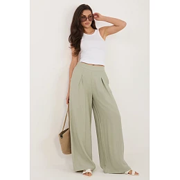 Stylové dámské kalhoty typu palazzo jsou skvělou kombinací pohodlí a elegance v každodenním provedení. Vyrobené z lehké, prodyšné směsi viskózy a polyamidu, poskytují pohodlí nošení a krásně padnou na postavě. Model s dlouhými, širokými nohavicemi dodává outfitu lehkost a moderní charakter, zároveň zaručuje volnost pohybu. Hladký materiál zdůrazňuje univerzálnost kalhot, díky čemuž je snadné je sladit s mnoha každodenními outfitmi. Na přední straně jsou ozdobné záložky, které dodávají eleganci a jemně modelují postavu. V pase je vsazena elastická guma, která zajistí pohodlné přizpůsobení bez nutnosti zapínání. Kalhoty nemají klasické zapínání, což zvyšuje pohodlí používání. Další výhodou jsou praktické boční kapsy. Jsou ideální volbou na každý den, skvěle se hodí jak do volných stylizací s tričkem, tak i do elegantnějších outfitů s košilí nebo halenkou.