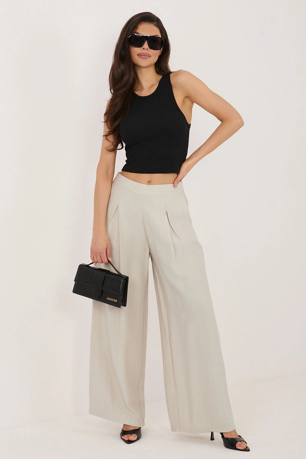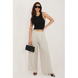Elegantní dámské kalhoty typu palazzo jsou skvělou kombinací pohodlí a elegance pro každodenní nošení. Vyrobené z lehké, prodyšné směsi viskózy a polyamidu, poskytují pohodlí a krásně padnou na postavě. Model s dlouhými, širokými nohavicemi dodává stylizaci lehkost a moderní charakter, zároveň zaručuje volnost pohybů. Hladký materiál zdůrazňuje univerzálnost kalhot, díky čemuž je snadno sladíte s mnoha každodenními outfitmi. Na přední straně jsou ozdobné záložky, které dodávají eleganci a jemně modelují postavu. V pase je vsazena elastická guma, která zajišťuje pohodlné přizpůsobení bez nutnosti zapínání. Kalhoty nemají klasické zapínání, což zvyšuje pohodlí nošení. Další výhodou jsou praktické boční kapsy. Jsou ideální volbou na každý den, skvěle se hodí jak do casual outfitů s tričkem, tak do elegančnějších stylizací s košilí nebo halenkou.