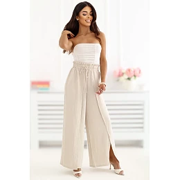 Dámské kalhoty typu wide leg jsou skvělou volbou pro každodenní nošení pro ženy, které ocení pohodlí a moderní styl. Model s širokými a dlouhými nohavicemi se krásně pohybuje, dodává postavě lehkost a uvolněný charakter. Hladký vzor činí kalhoty univerzální a snadno kombinovatelné, skvěle ladí jak s jednoduchými tričky, tak s elegantnějšími halenkami. Rozparky na nohavicích přidávají celkovému vzhledu jemnou lehkost a módní akcent. Šňůrka v pase a jemné záhyby zajistí pohodlné přizpůsobení a zdůrazní pas, zároveň dodá kalhotám zajímavější tvar. Chybějící kapsy zdůrazňují minimalistický charakter modelu. Vyrobené z měkké a elastické směsi viskózy a elastanu, kalhoty zaručují pohodlí po celý den. Stylový a pohodlný návrh ideální pro každodenní outfit. Poznámka: Velikost na štítku M/L, ale model je menší - odpovídá velikosti S/M (menší).