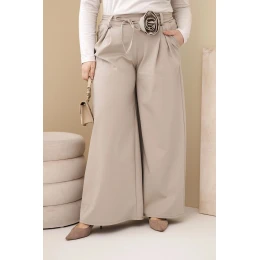Dámské kalhoty Plus Size s širokou nohavicí a ozdobným květem v pase béžové