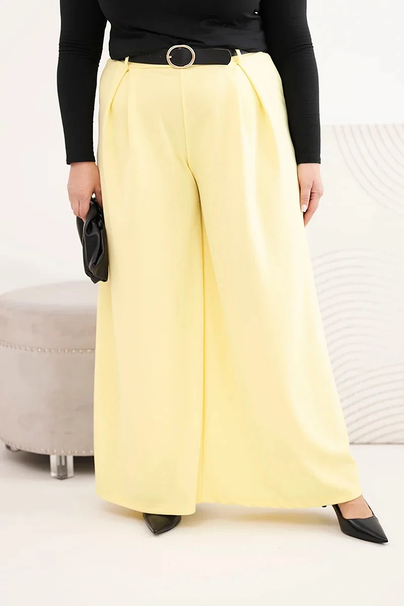 Dámské kalhoty Plus Size se širokou nohavicí a páskem žluté