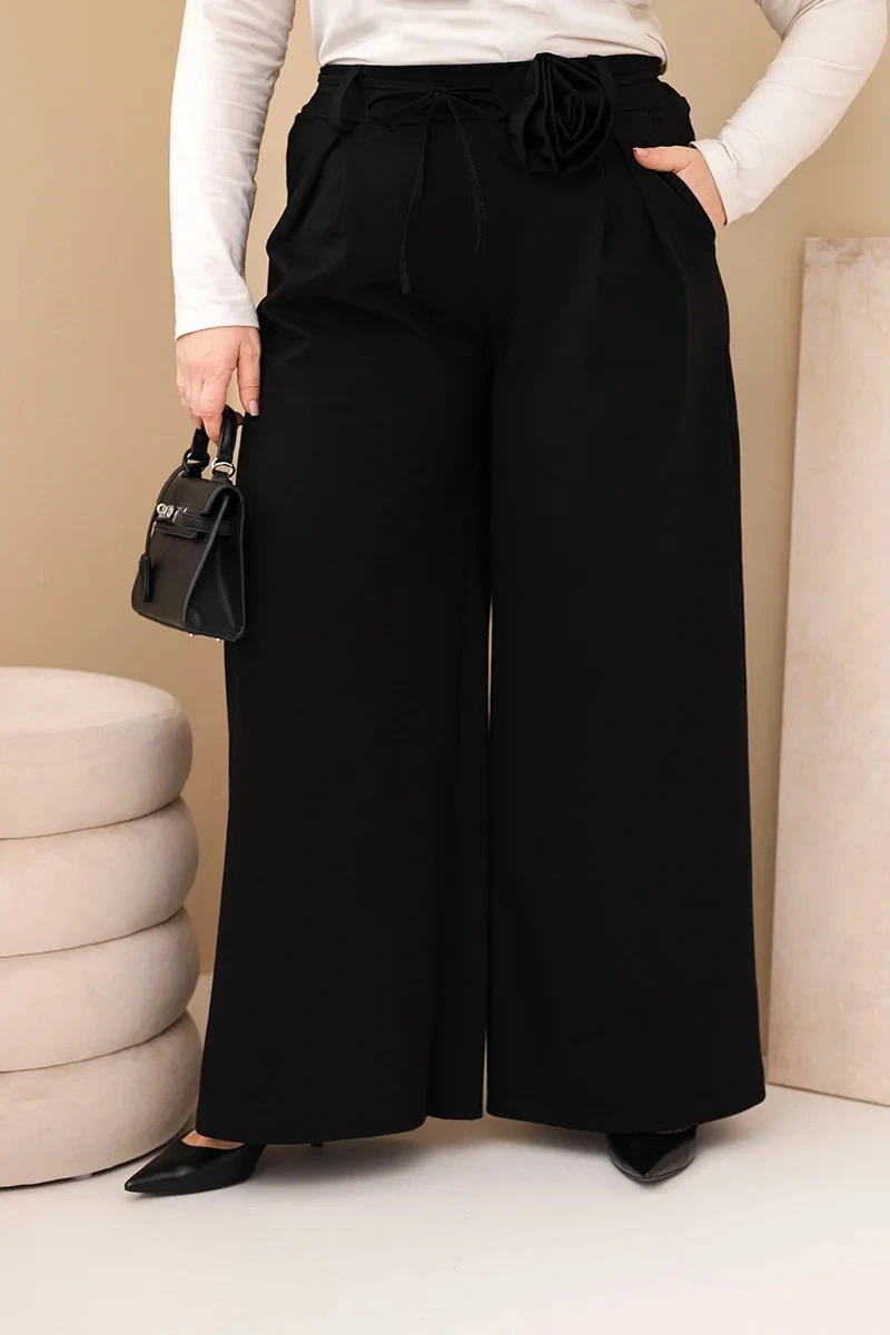 Dámské kalhoty Plus Size se širokým nohavicí a ozdobným květem v pase černé