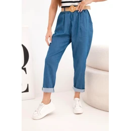Dámské kalhoty s ohrnutou nohavicí a páskem tmavě džínové