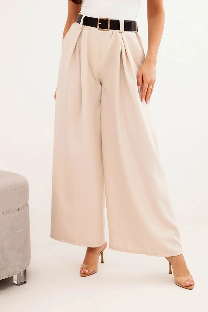 Dámské kalhoty s širokou nohavicí a páskem světlé béžové