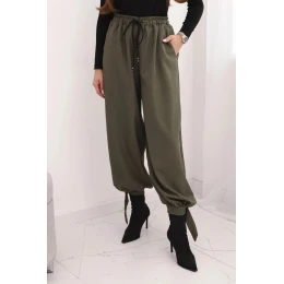 Dámské kalhoty s širokým nohavicí a vázáním dole khaki