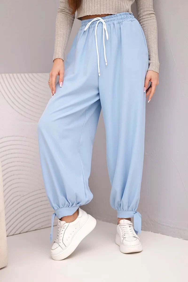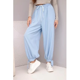 Dámské kalhoty s širokým nohavicím a zavazováním dole modré
