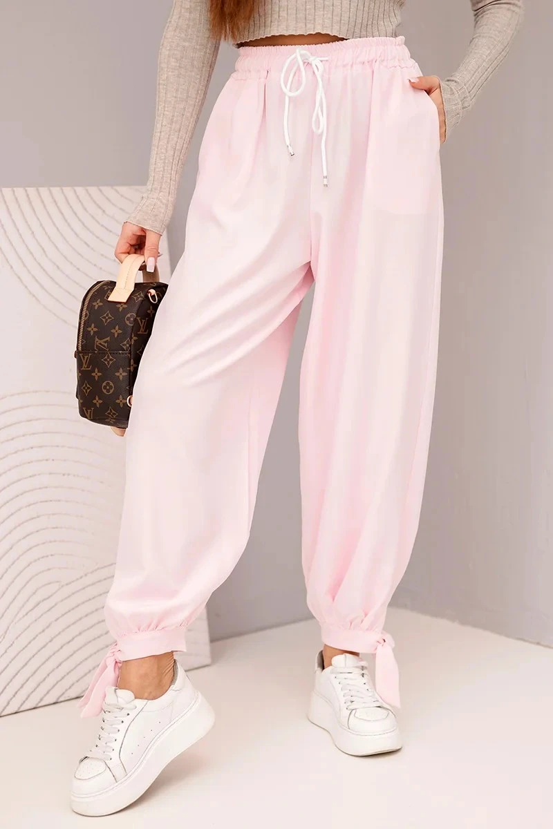 Dámské kalhoty s širokými nohavicemi a zavazováním dole cukrově růžový