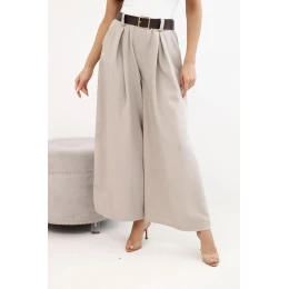 Dámské kalhoty se širokými nohavicemi a páskem tmavě béžové