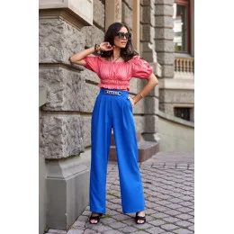 Dámské dlouhé volné kalhoty vespodu rozšířené. Ve přední části ozdobná spona imitující zlatý hrubý řetěz. Délka kalhot 110 cm.