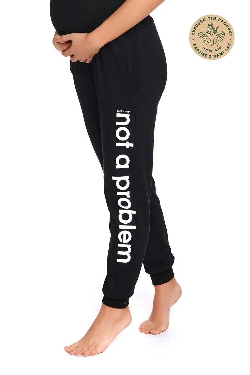 Dámské černé teplákové kalhoty ve stylu "homewear" s prodlouženým střihem pro těhotné ženy.