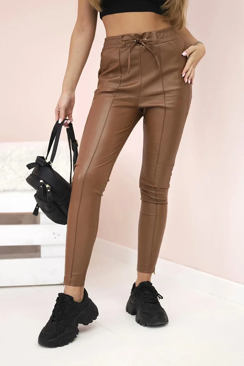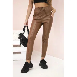 Dámské kalhoty z eko kůže s vázáním a rozparkem na nohavici hnědé