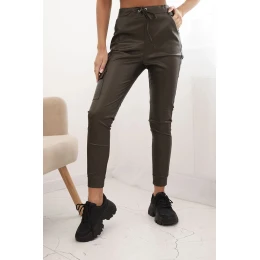 Dámské kalhoty z ekokůže s kapsami a šněrováním v pase khaki