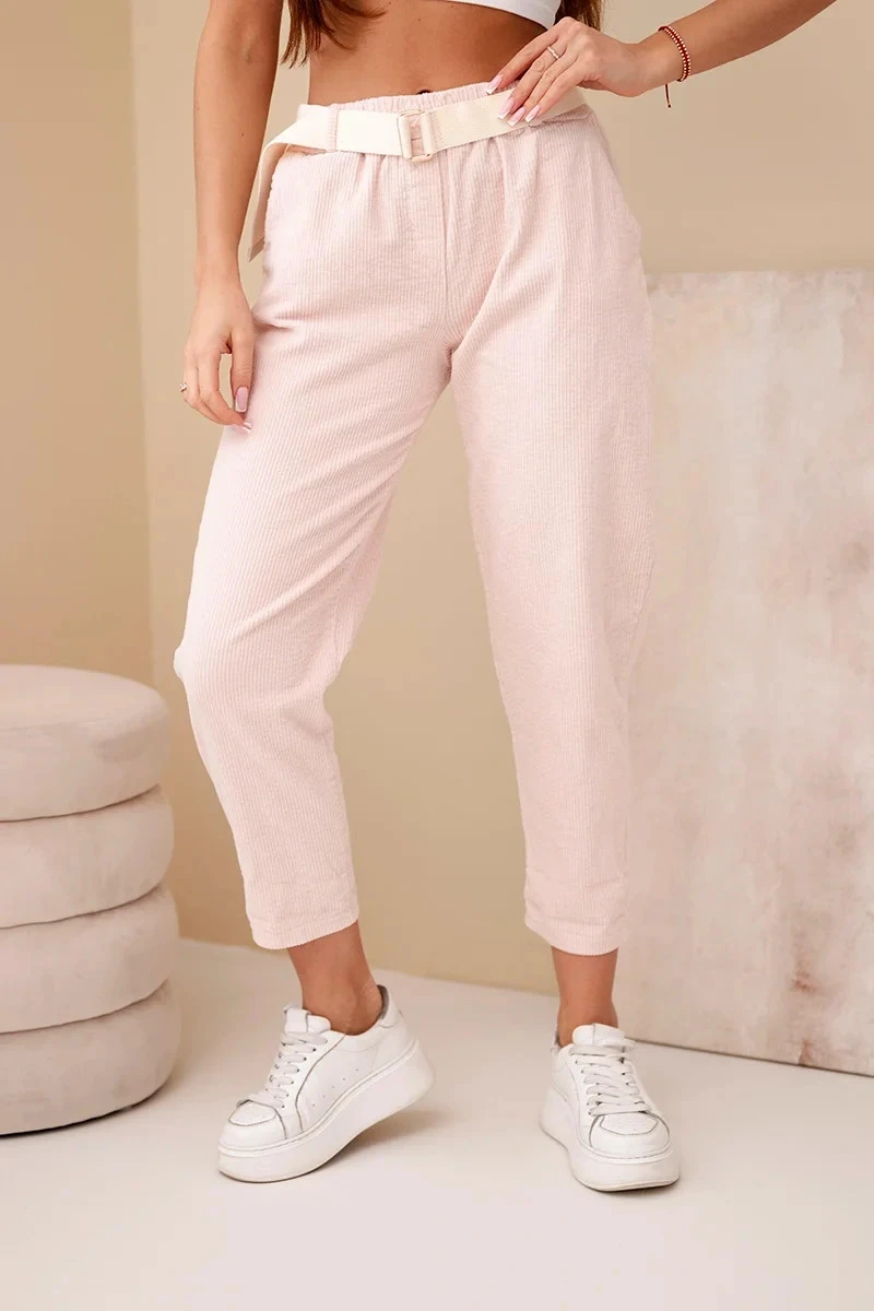 Pohodlné a módní dámské kalhoty z měkkého manšestru jsou skvělou volbou na chladnější dny. Jejich moderní střih se zúženými nohavicemi a elastickým pasem zajišťuje dokonalé přizpůsobení postavě a vysoký komfort nošení. Součástí soupravy je látkový pásek, který zvýrazňuje pas a dodává stylové zakončení celé stylizaci.