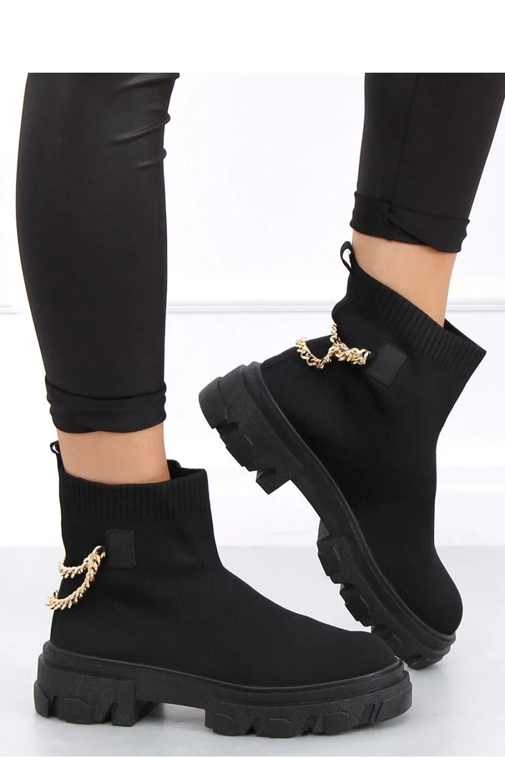 Dámské boty na širokém 5cm podpatku. Tento trendy střih na vysoké podrážce je naprostým must have sezóny! Jsou vyrobeny z látky podobné ponožkám, díky čemuž dokonale přiléhají k noze. Zlatý řetízek na zadní straně je stylovou tečkou celého designu... Model bez izolátoru. Vnější materiál - tkanina. Uvedená délka stélky je délka chodidla, na které se hodí daná velikost. Materiál - textil Hřejivá podšívka - bez hřejivé podšívky