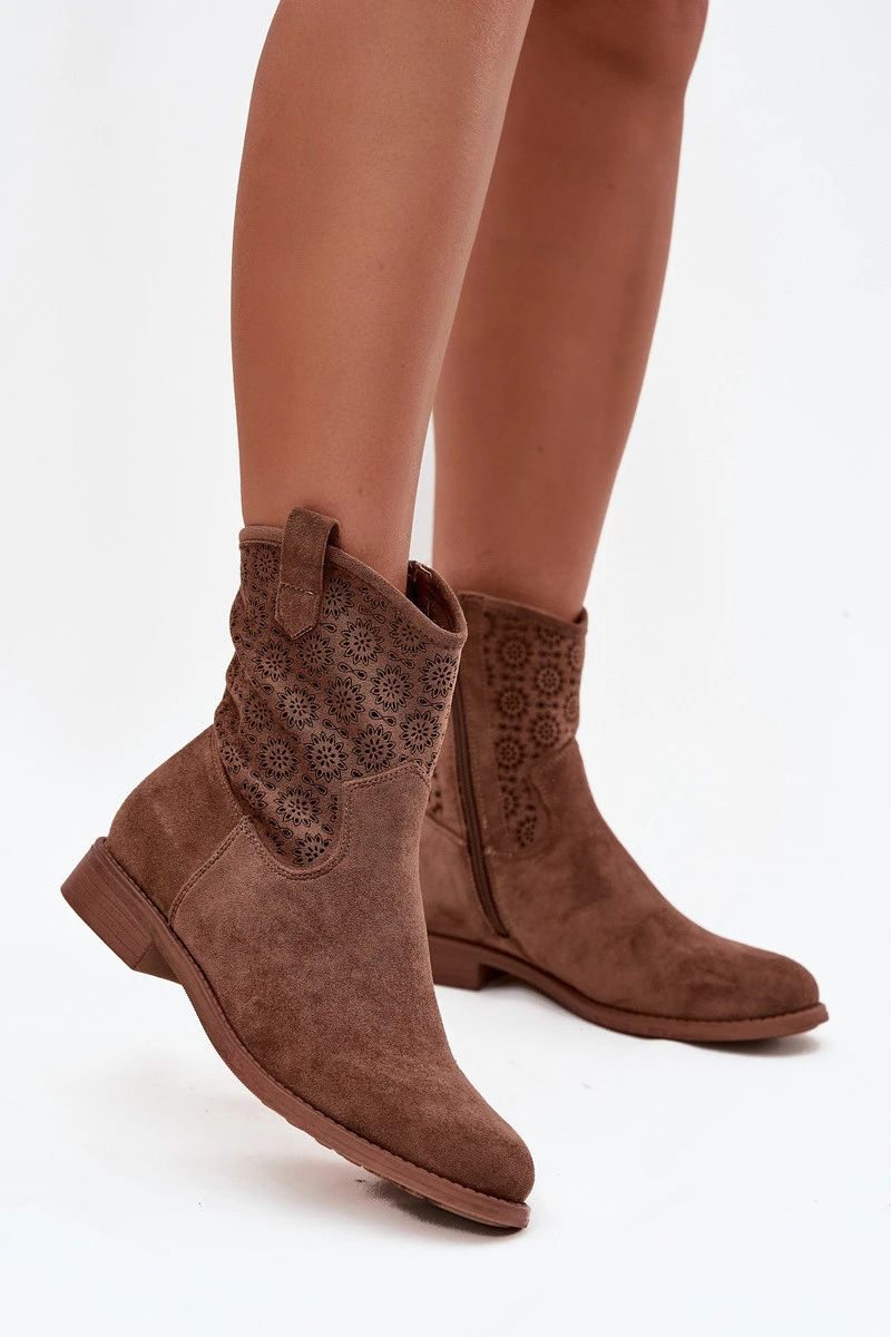 Dámské kotníkové boty na plochém podpatku s ažurovým vzorem S.Barski – hnědé