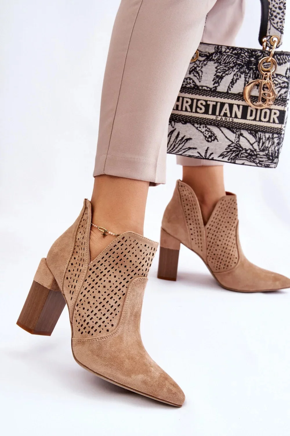 Ažurové boty s módním jehlovým podpatkem z měkkého eko-semiše s výřezy na bocích svršku. Klasický nazouvací model se zpevněnou patou. Měkká a pohodlná stélka z ekologické kůže. Podpatek na jehlovém podpatku a špičatá špička opticky zeštíhlují nohy.