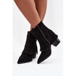Dámské boty vyrobené z eko semiše. Model je osazen na stabilním sloupkovém podpatku, který krásně zeštíhluje siluetu a přidává několik centimetrů na výšce, přičemž zachovává pohodlí při nošení. Charakteristickým prvkem je vykloněná horní část, která přechází přes podpatek, což dodává výjimečný vzhled a odlišuje je od klasických střihů. Špičaté nosy dále zvýrazňují štíhlou linii obuvi. Praktické zapínání na zip usnadňuje obouvání a sundávání. Tyto boty jsou ideální pro ženy, které hledají stylové doplnění podzimně-zimních outfitů – jak pro každodenní nošení, tak pro formálnější příležitosti. Při výběru velikosti se řiďte tabulkou velikostí. Při výběru velikosti se řiďte tabulkou velikostí.