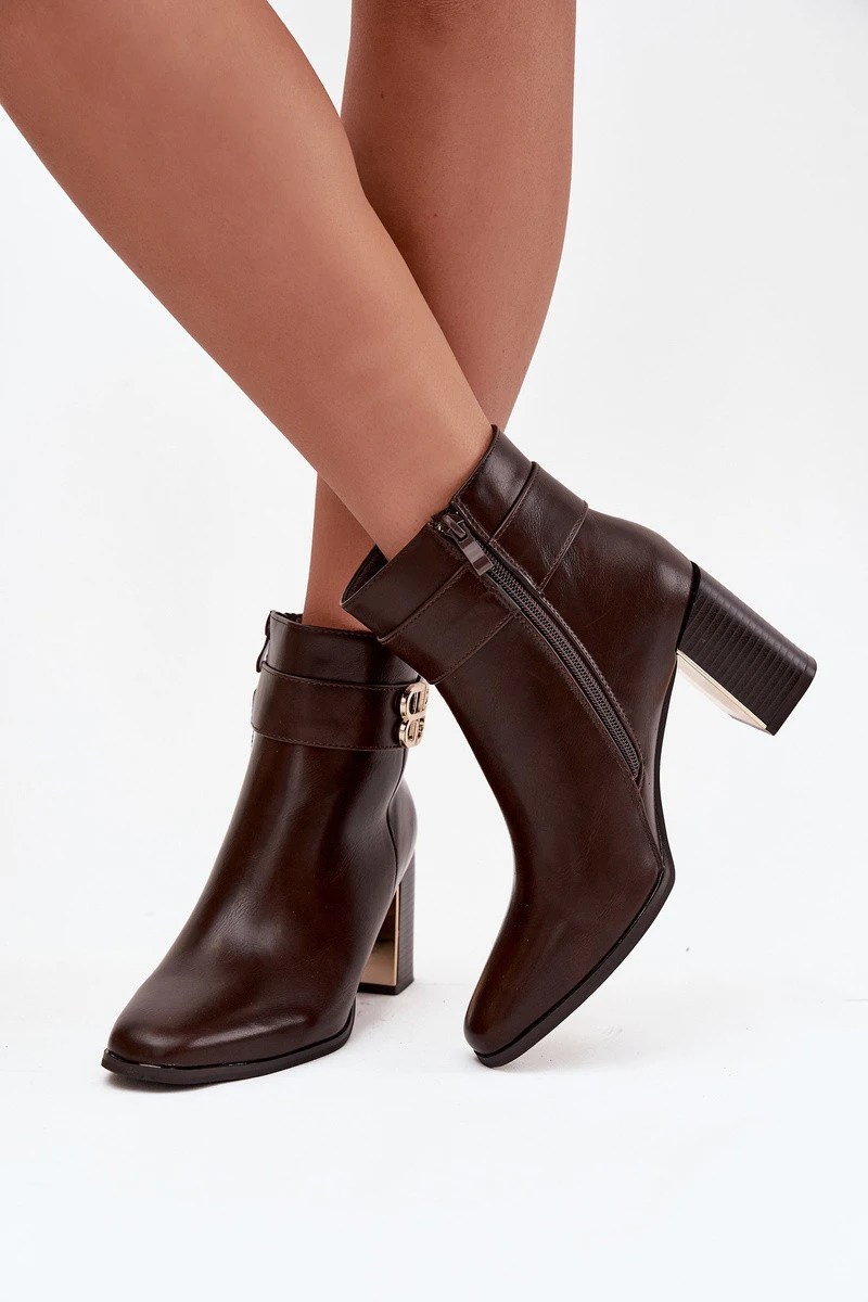 Dámské kotníkové boty na podpatku s páskem a zlatým detailem čokoládové Galinne