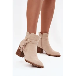 Dámské kotníkové boty vyrobené z ekozamše. Klasický střih s kulatými špičkami je ozvláštněn páskem s třásněmi, který botám dodává originalitu. Model na stabilním podpatku typu sloup krásně zeštíhluje postavu a zároveň poskytuje pohodlí při každodenním nošení. Praktické zapínání na zip usnadňuje obouvání a sundávání, díky čemuž jsou boty pohodlné na nošení. Tento pár obuvi je ideální na podzimní a zimní sezónu a dokonale doplní jak volnočasové, tak i elegantnější outfity. Při výběru velikosti se řiďte tabulkou velikostí.