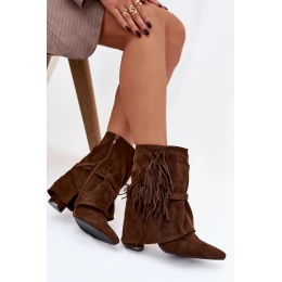 Dámské kotníkové boty na sloupkovém podpatku s třásněmi a zlatými přezkami Evelisse – hnědé