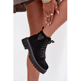 Dámské boty vyrobené z eko semiše. Model se zapínáním na zip a dodatečným šněrováním, což zajišťuje dokonalé padnutí na nohu. Zaoblené špičky zaručují pohodlí při nošení. Svršek zdobený lesklým srdcem dodává kouzlo a jedinečný charakter. Ideální na každodenní nošení, skvěle doplní casualní styl. Při výběru velikosti se řiďte tabulkou velikostí.