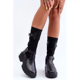 Dámské, módní zimní boty jsou vyrobeny z eko kůže a látky. Střih do poloviny lýtka s dekoračními pásky na obuvi. Osazené na masivní platformě s pevnou špičkou. Měkká, materiálová vložka zajišťuje pohodlné nošení. Tento model je nazouvací a má ponožkovou choleň. Při výběru velikosti se řiďte tabulkou velikostí.