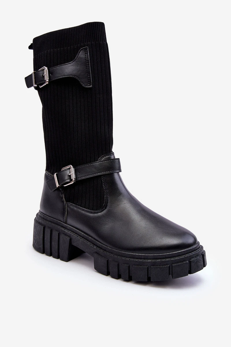 Dámské, módní zimní boty jsou vyrobeny z eko kůže a látky. Střih do poloviny lýtka s dekoračními pásky na obuvi. Osazené na masivní platformě s pevnou špičkou. Měkká, materiálová vložka zajišťuje pohodlné nošení. Tento model je nazouvací a má ponožkovou choleň. Při výběru velikosti se řiďte tabulkou velikostí.