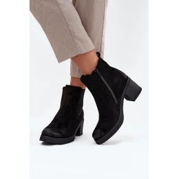 Černé zateplené boty Zelia z eko semiše. Jsou osazeny sloupkovým podpatkem (cca 7 cm), mají boční zip pro pohodlné nazouvání a vnitřní zateplení pro teplo během chladných dní. Elegantní design s jemným zlatým detailem po straně podtrhuje stylovou praktičnost.