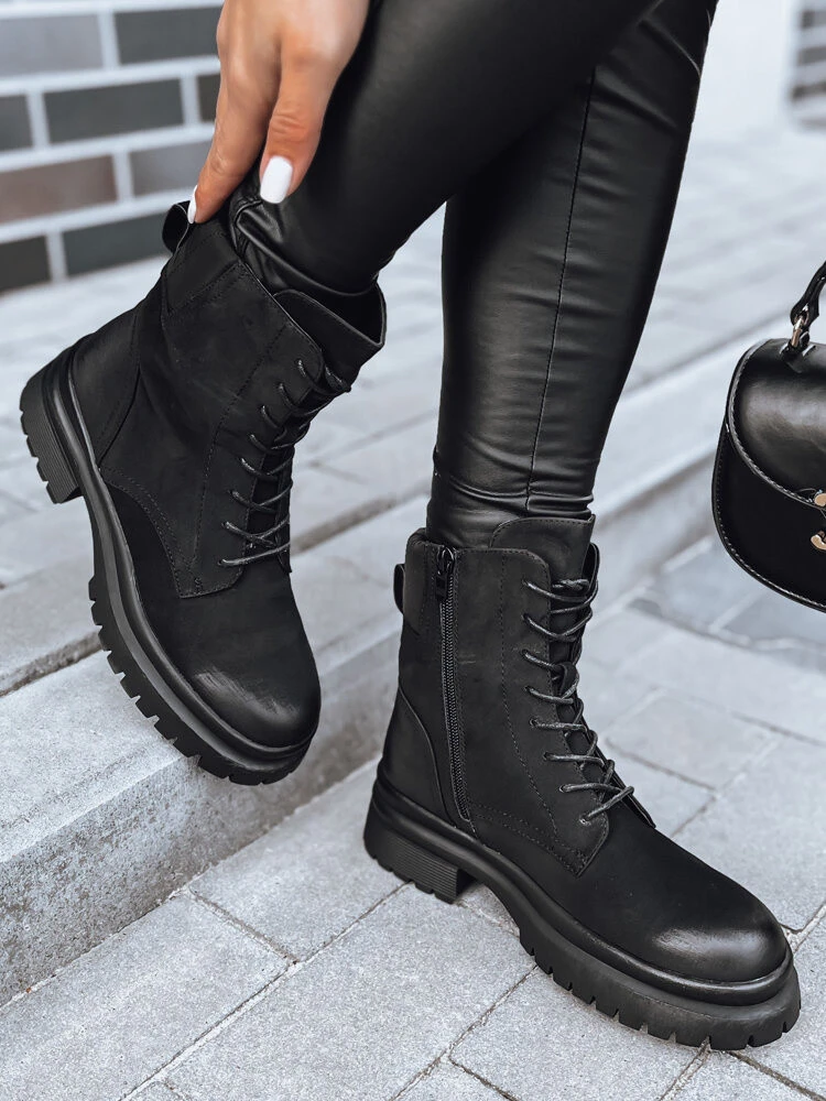 Tyto šněrovací kozačky vyrobené z kvalitní imitace semiše jsou nezbytným doplňkem při tvorbě podzimně-zimních outfitů. Sedí na silné podrážce a mají také zip na vnější straně boty. Budou vypadat perfektně ke kalhotám i šatům. Model je k dispozici ve čtyřech barvách.