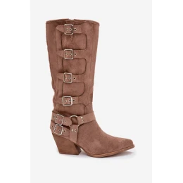 Dámské kozačky kovbojského stylu na podpatku s přezkami Fivelle – tmavě béžové
