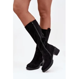 Dámské kozačky vyrobené z ekologické semišové kůže. Model s uzávěrem na zip. Upevněny na stabilním podpatku ve tvaru kostky, což zajišťuje pohodlí a jistotu kroku. Zaoblené špičky dodávají celku jemný, ženský charakter. Vnitřek vyhřátý pěnou pokrytou látkou zaručuje teplo a pohodlí v chladnějších dnech. Klasický střih umožňuje, aby kozačky skvěle ladily jak s přiléhavými kalhotami typu skinny, tak s šaty či sukněmi, čímž vytvářejí stylové a univerzální sady na různé příležitosti. Při výběru velikosti se řiďte tabulkou velikostí.