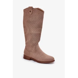 Dámské kozačky na nízkém podpatku s perforovaným vzorem S.Barski – béžové, eko kůže
