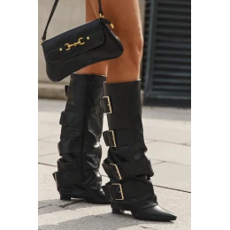 Stylové dámské kozačky Isavelle v černé barvě kombinují moderní design s elegantními zlatými přezkami. Vyhrnutá horní část dodává botám výrazný detail a módní nádech, zatímco stabilní podpatek poskytuje pohodlnou chůzi. Hladký materiál a precizní provedení dodávají modelu luxusní vzhled. Praktický postranní zip zajišťuje snadné a rychlé obouvání.