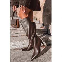 Dámské kozačky vyrobené z ekologické kůže jsou výjimečně stylovým návrhem pro ženy, které oceňují eleganci a moderní vzhled. Model se vyznačuje elegantním tvarem, který dokonale zvýrazní nohy a dodá postavě lehkost. Špičaté nosy v kombinaci s jehlou dodávají ženský charakter a elegantní vzhled. Kozačky jsou nazouvací, což zajišťuje pohodlí při obouvání, a šev probíhající podél přední části horního lemu je jemný dekorační prvek, který podtrhuje jejich elegantní linii. Vyrobené s důrazem na detaily, budou skvělým doplňkem jak večerních šatů, tak casualových outfitů s přiléhavými kalhotami. Při výběru velikosti prosíme podle tabulky velikostí. Při výběru velikosti se řiďte tabulkou velikostí.