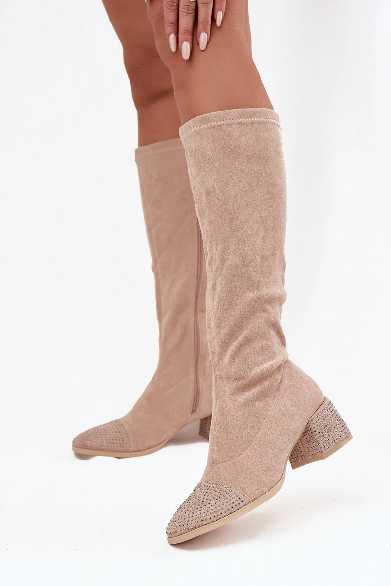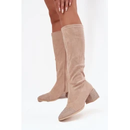 Dámské kozačky s ozdobou na bloku Eko semiš béžové Ivanna