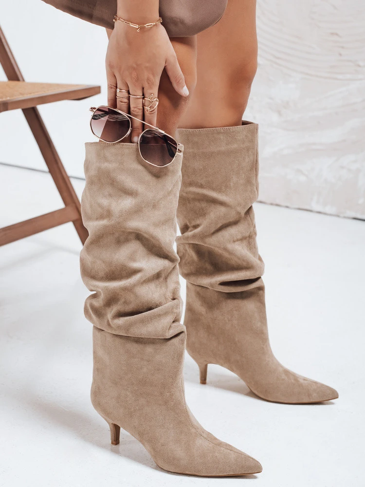 Dámské kozačky s vysokým řaseným svrškem z ekologické semišové kůže jsou elegantním návrhem pro ženy, které si cení módního vzhledu a pohodlí. Úzký 6cm podpatek decentně zvýrazňuje siluetu a nazouvací střih usnadňuje obouvání a přizpůsobení noze.