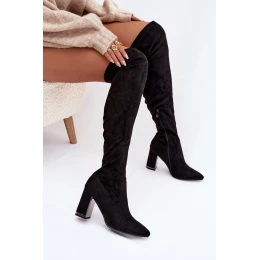 Dámské kozačky z eko-semiše nad kolena na sloupku – černé Thamine